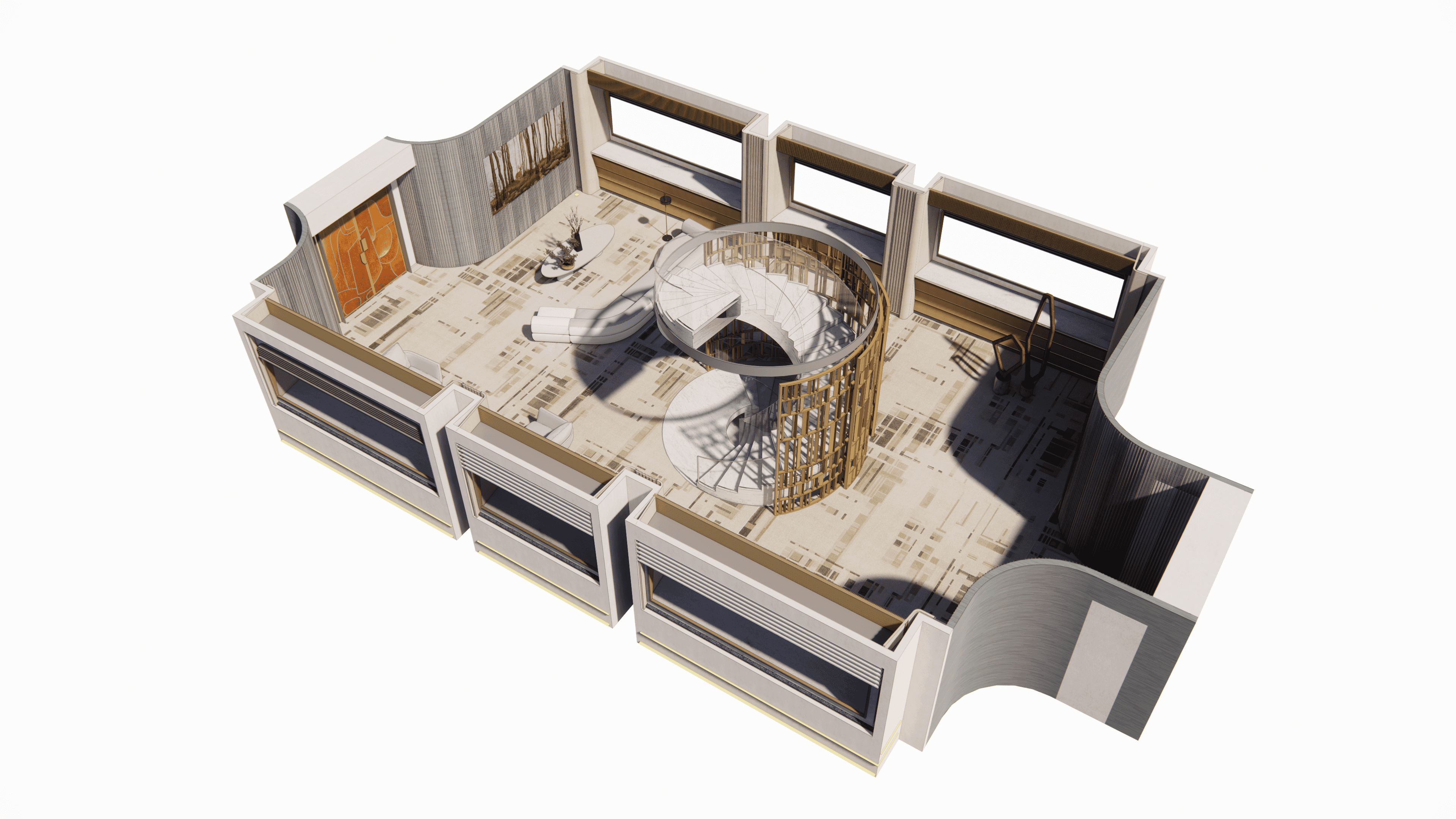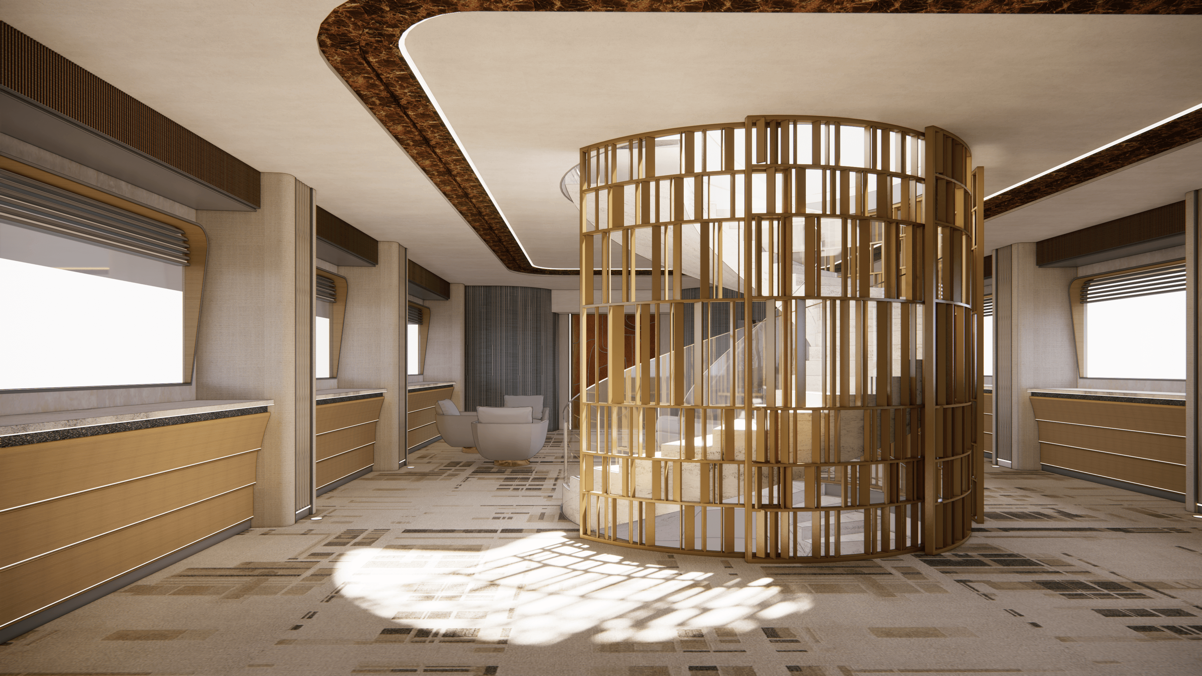tower lobby, gate design, 3-storey flying membership club interior design, featuring a flight simulation room and feature bar lounge with aviation curved windows.